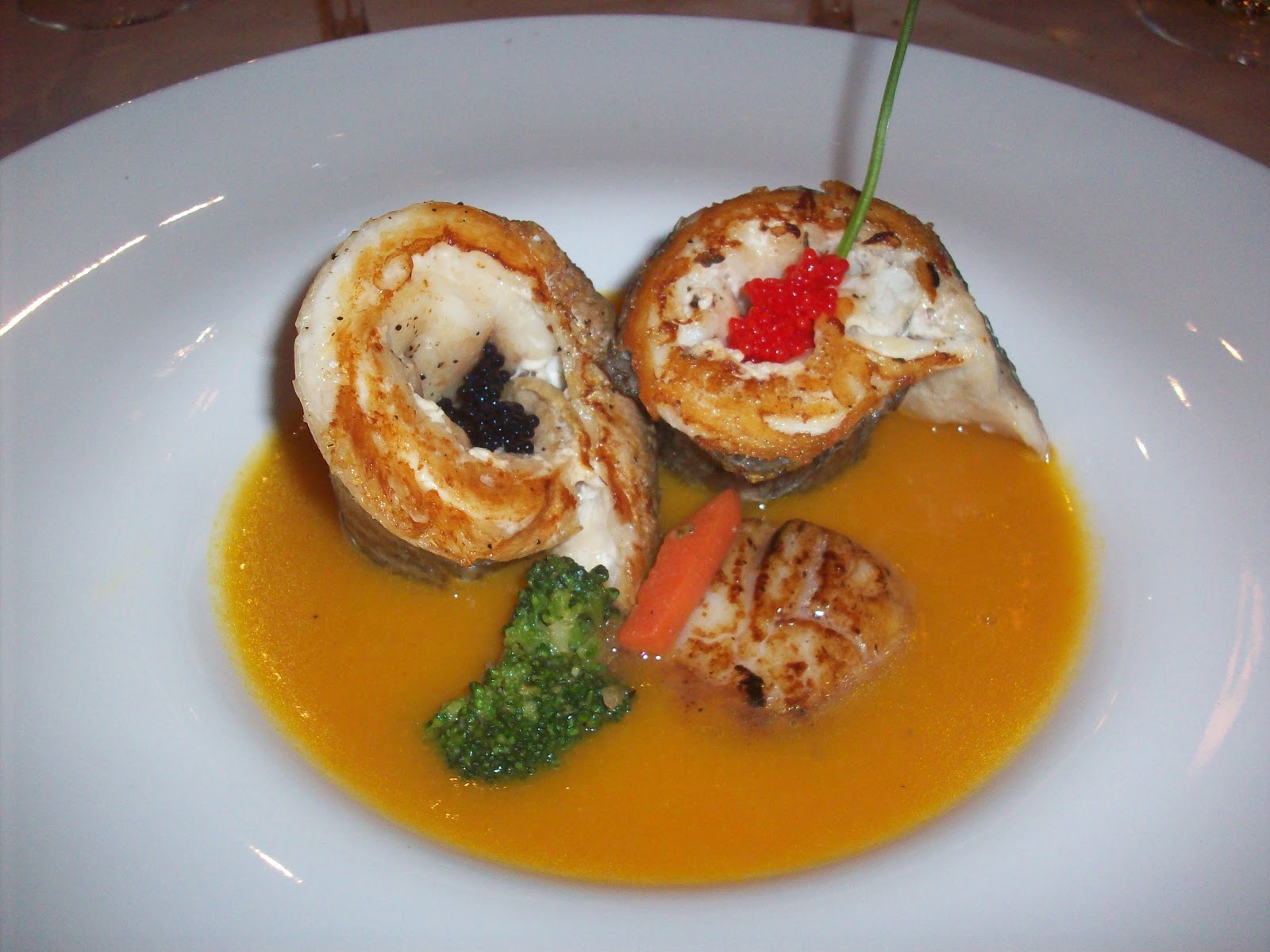 No recuerdo exactamente si era éste el nombre del plato en el menú, pero creo recordar que llevaba todo esto. Nos encantó la forma de presentar en el plato la lubina a la plancha, enrollada sobre si misma con las huevas de pescado en el hueco del centro y sobre un caldo delicioso donde vemos en primer plano un trocito de brócoli, zanahoria y la zamburiña (de un tamaño considerable) hecha a la plancha también. El caldo no recuerdo bien de qué era, pero el conjunto era un excelente pescado que merece la pena probar.